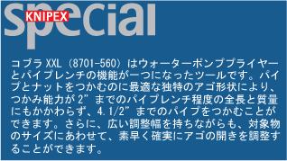 100年を越える伝統。ドイツの職人気質と最新技術が融合した、世界的なプライヤーブランド「クニペックス」。 ヨーロッパ最大のプライヤーメーカーとして世界中で人気を博しているクニペックス社。創業は1882年にまでさかのぼり、伝統と製造ノウハウあふれる製品を幅 広く提供しています。約800点を数えるアイテムの中で、最も有名なのがコブラやアリゲータと名付けられた、3枚合せのウォーターポンププライヤー。クニペックス社が特許を持つこの製品は高い操作性と耐久性を誇る高性能プライヤーの定番となっており、受け継がれてきた伝統と独自の技術が見事に調和しています。 | |